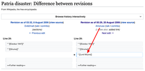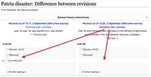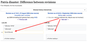 In the following example, McKay’s two accounts, “McKay” and “Zero0000,” made two edits in the Patria disaster article in order to remove content placed by another editor:
